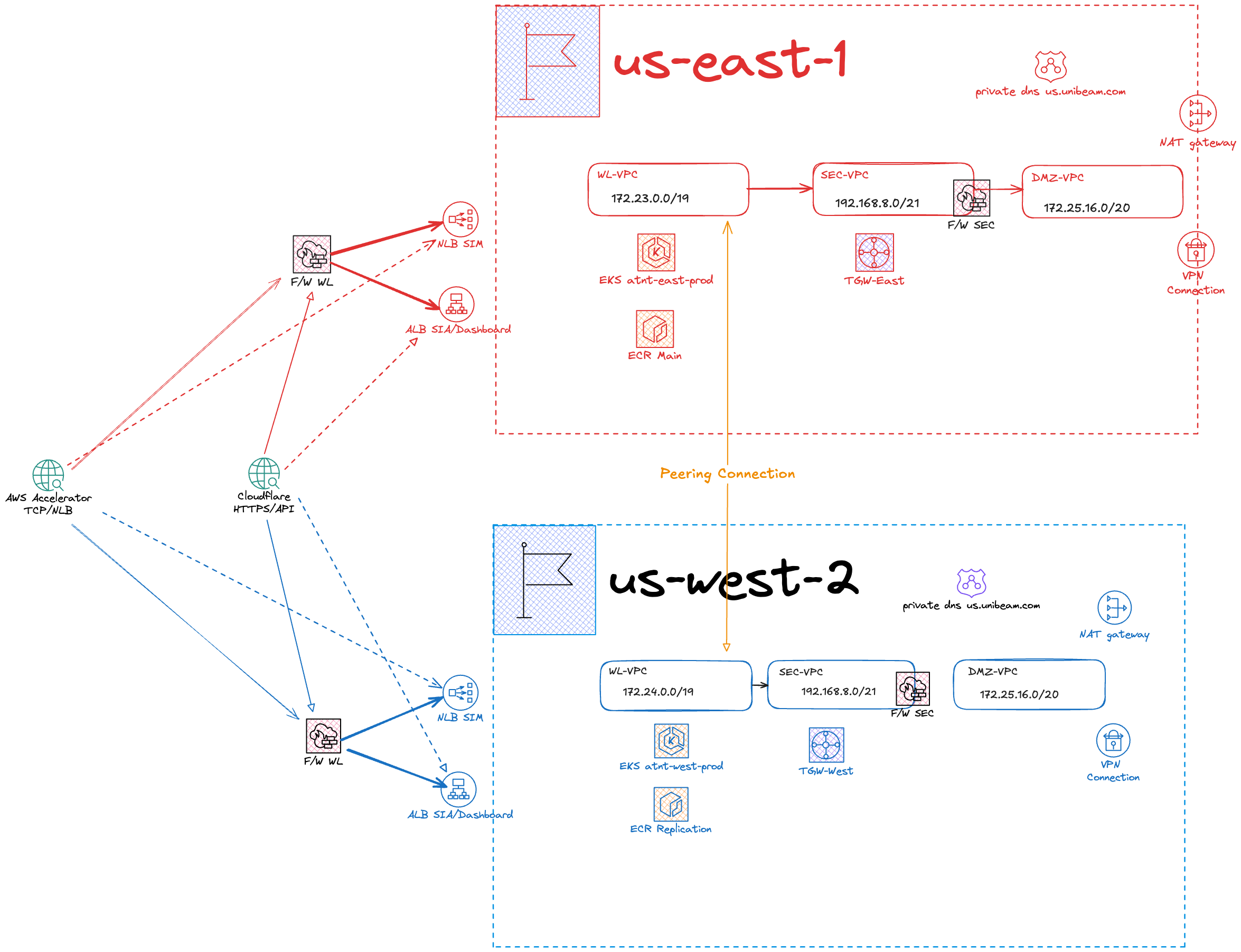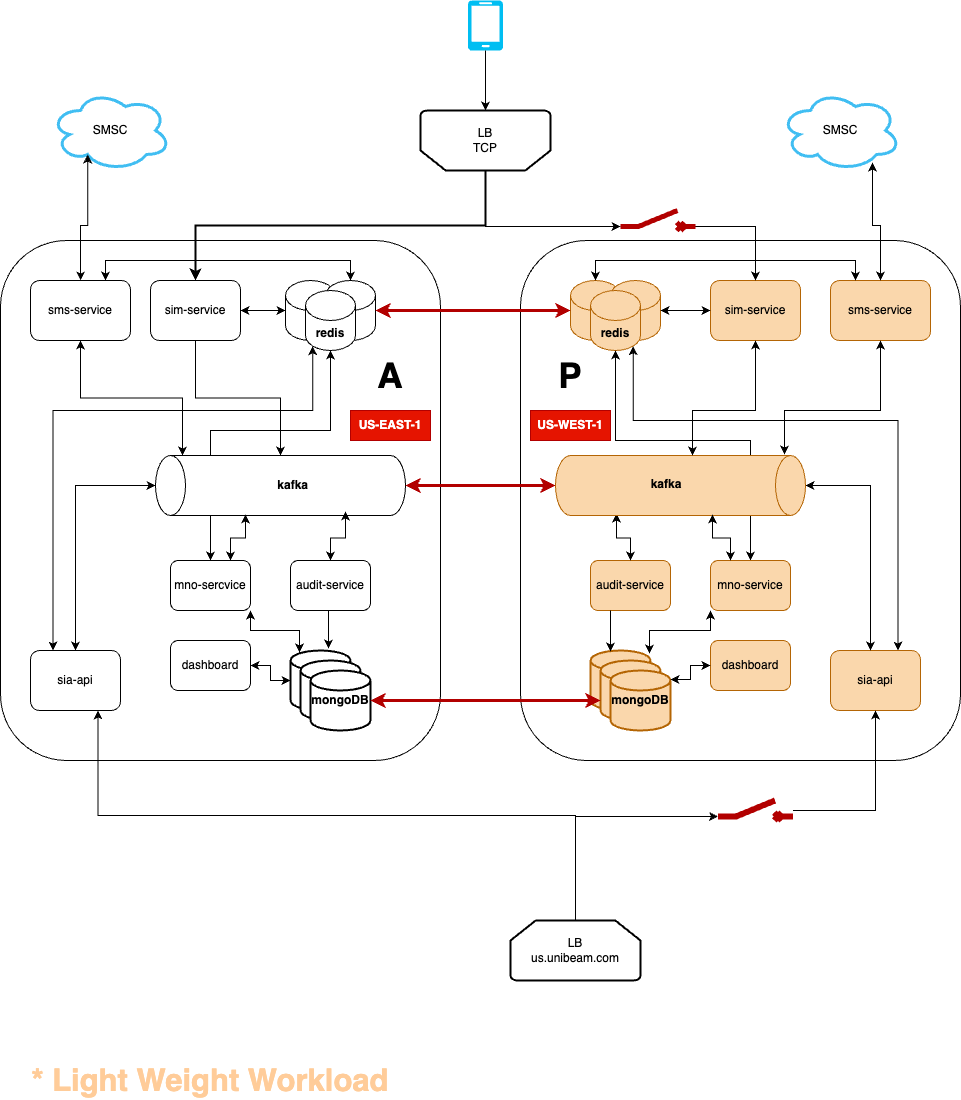 US-EAST-1 region will run majority workload, this includes replication sets for each application, for increased load. US-WEST-2 will be running in โlight modeโ with less workers, and be increased once more load will be introduced.